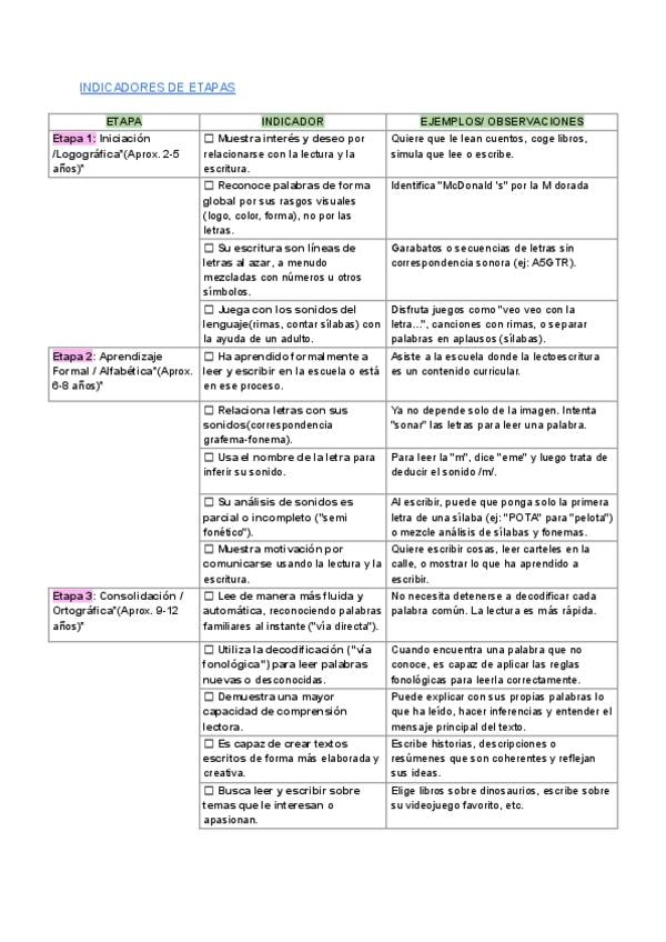 Esta es una tabla con indicadores de cada etapa de la escritura en infantil para poder identificar en cuál está el niño/a