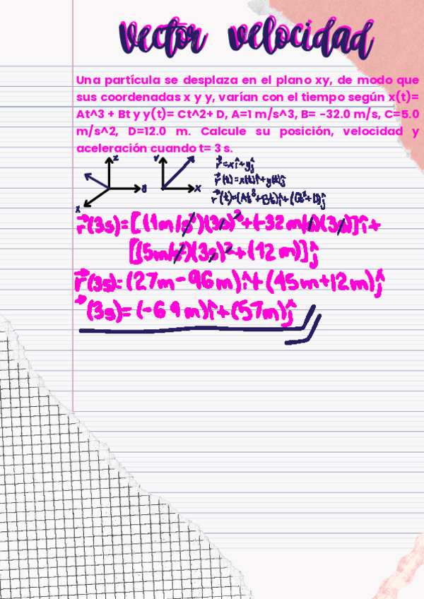 Una partícula se desplaza en el plano xy, de modo que sus coordenadas x y y, varían con el tiempo según x(t)= At^3 + Bt y y(t)= Ct^2+ D, A=1 m/s^3, B= -32.0 m/s, C=5.0 m/s^2, D=12.0 m. Calcule su posición, velocidad y aceleración cuando t= 3 s.