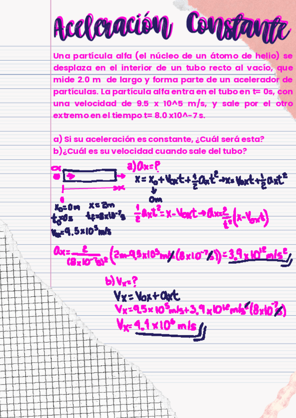Una partícula se desplaza en el interior de un tubo que mide 2.0 m de largo. La partícula entra en el tubo en t= 0s, con una velocidad de 9.5 x 10^5 m/s, y sale por el otro extremo en el tiempo t= 8.0 x10^-7 s.