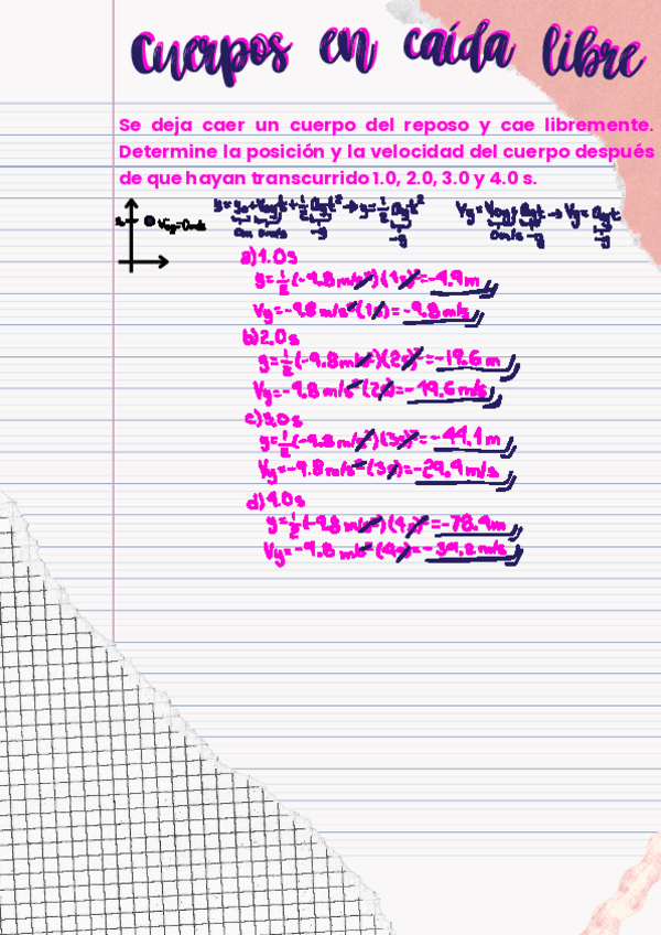 Se deja caer un cuerpo del reposo y cae libremente. Determine la posición y la velocidad del cuerpo después de que hayan transcurrido 1.0, 2.0, 3.0 y 4.0 s.