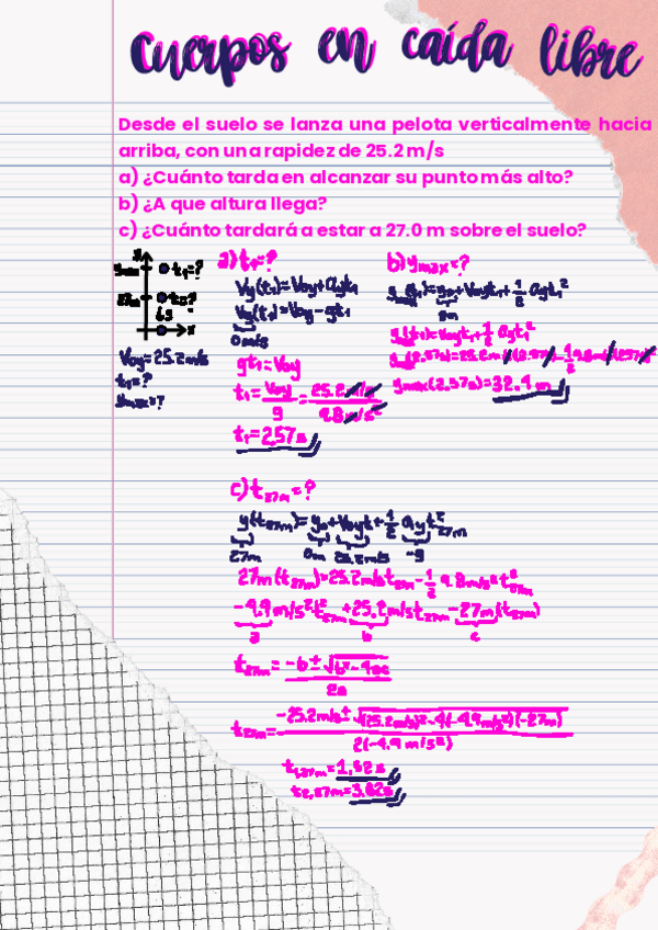 Desde el suelo se lanza una pelota verticalmente hacia arriba, con una rapidez de 25.2 m/s a) ¿Cuánto tarda en alcanzar su punto más alto? b) ¿A que altura llega? c) ¿Cuánto tardará a estar a 27.0 m sobre el suelo?