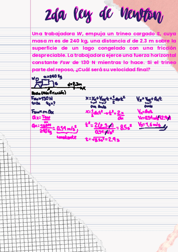 Una trabajadora W, empuja un trineo S, cuya masa m es de 240 kg, una distancia d de 2.3 m sobre un lago congelado con fricción despreciable. La trabajadora ejerce una fuerza Fsw de 130 N. Si el trineo parte del reposo, ¿Cuál será su velocidad final?