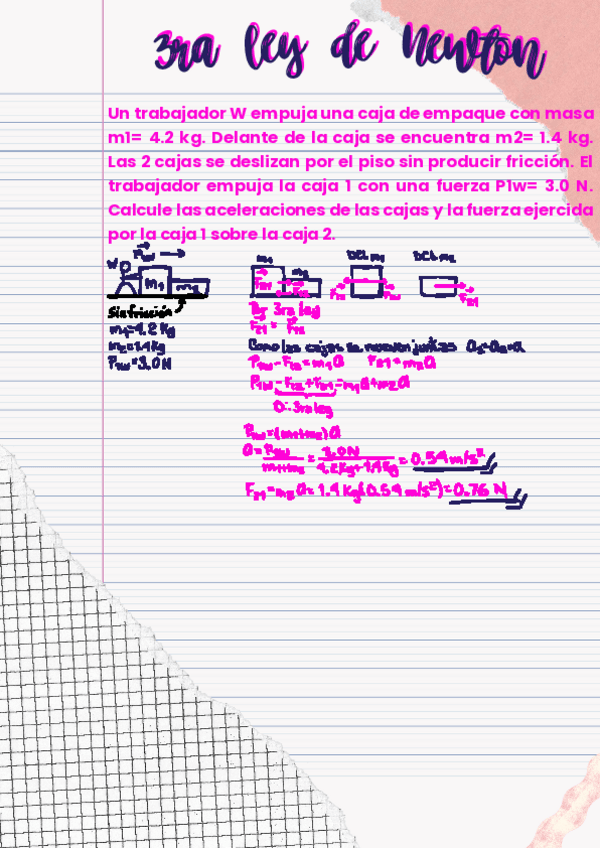 Un trabajador empuja una caja m1= 4.2 kg. Delante de la caja se encuentra m2= 1.4 kg. Las 2 cajas se deslizan por el piso fricción. El trabajador empuja la caja 1 con una fuerza P1w= 3.0 N. Calcule la aceleración y la fuerza por la caja 1 sobre la caja 2.