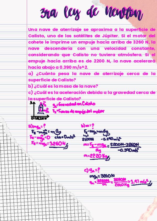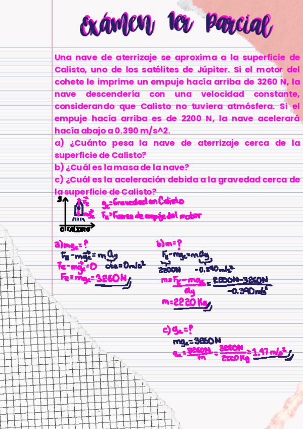 Una nave se aproxima a la superficie de Calisto, uno de los satélites de Júpiter. a) ¿Cuánto pesa la nave cerca de la superficie de Calisto? b) ¿Cuál es la masa de la nave? c) ¿Cuál es la aceleración debida a la gravedad cerca de la superficie de Calisto?