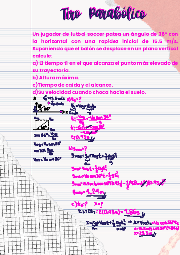Un jugador patea un ángulo de 36° con la horizontal con una rapidez inicial de 15.5 m/calcule: a) Tiempo en que alcanza el punto más alto. b) Altura máxima. c)Tiempo de caída y alcance. d)Su velocidad cuando llega al suelo