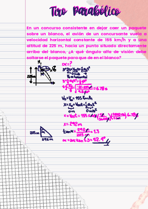 En un concurso se deja caer un paquete sobre un blanco, el avión de un concursante vuela a velocidad horizontal constante de 155 km/h y a una altitud de 225 m, ¿A qué ángulo debe soltarse para que de en el blanco?