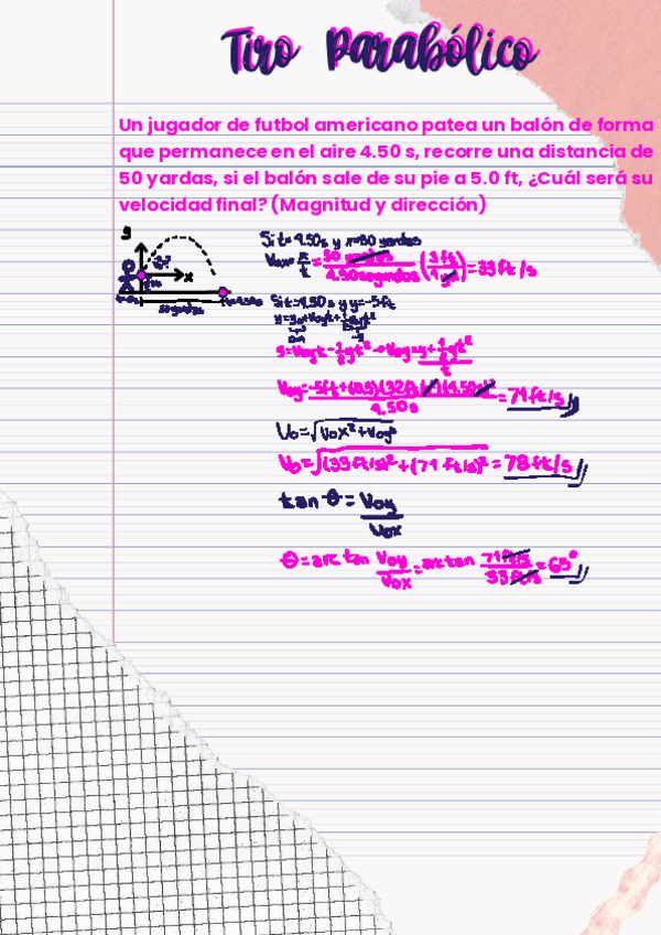 Un jugador de futbol americano patea un balón de forma que permanece en el aire 4.50 s, recorre una distancia de 50 yardas, si el balón sale de su pie a 5.0 ft, ¿Cuál será su velocidad final? (Magnitud y dirección)