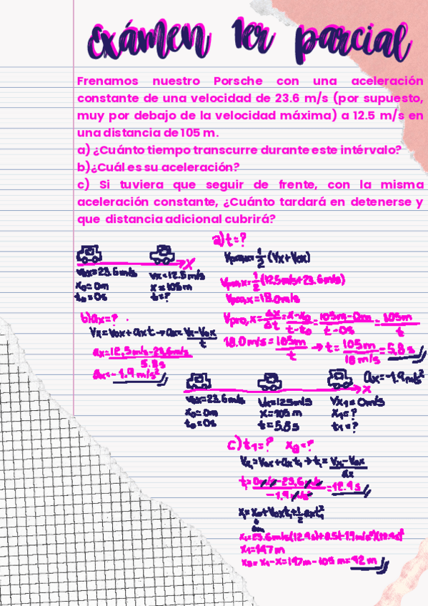 Frenamos nuestro Porsche con una aceleración constante de una velocidad de 23.6 m/s (por supuesto, muy por debajo de la velocidad máxima) a 12.5 m/s en una distancia de 105 m.