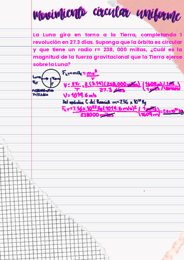 La Luna gira en torno a la Tierra, completando 1 revolución en 27.3 días. Suponga que la órbita es circular y que tiene un radio r= 238, 000 millas, ¿Cuál es la magnitud de la fuerza gravitacional que la Tierra ejerce sobre la Luna?