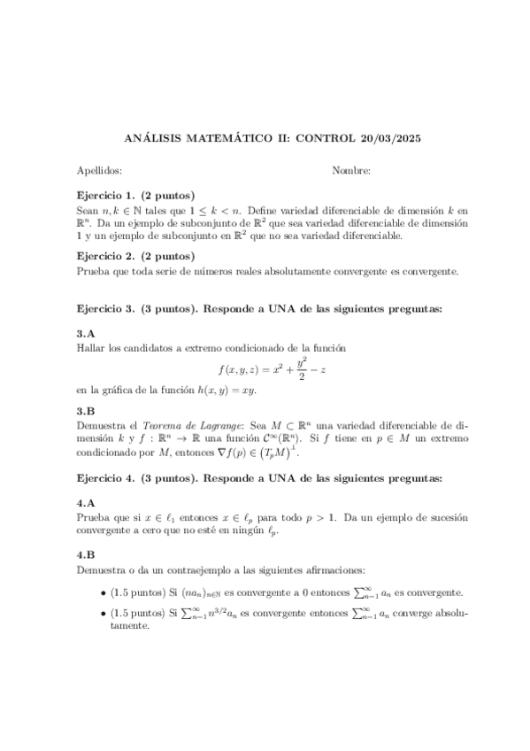 Control de mitad de curso del Tema 1. Variedades Diferenciables y Tema 2. Series De Números Reales.