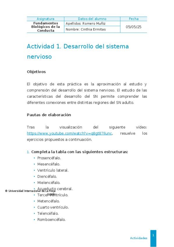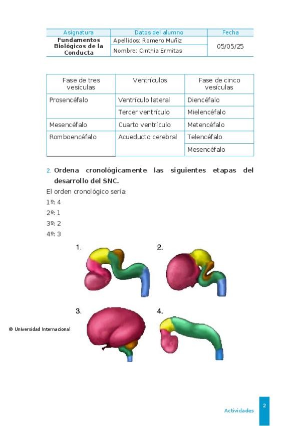 Actividad 1 (individual). Desarrollo del Sistema Nervioso. Calificación 10/10