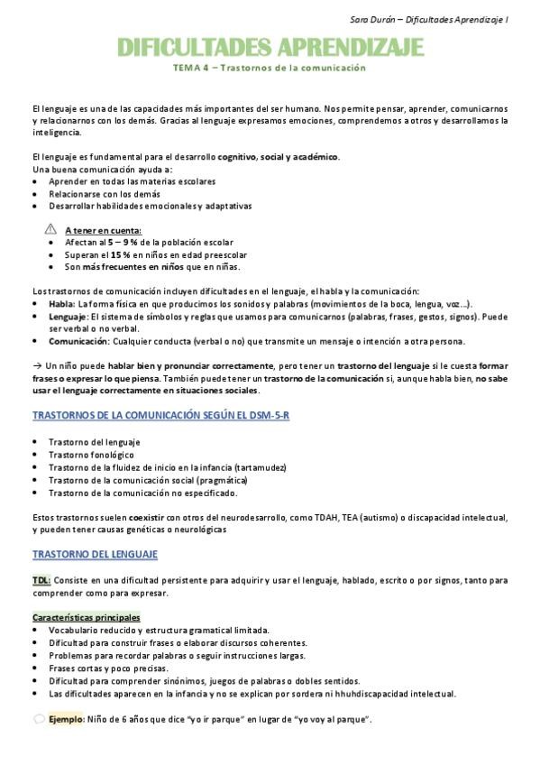 Resumen tema 4, Trastornos de la comunicación, dificultades aprendizaje