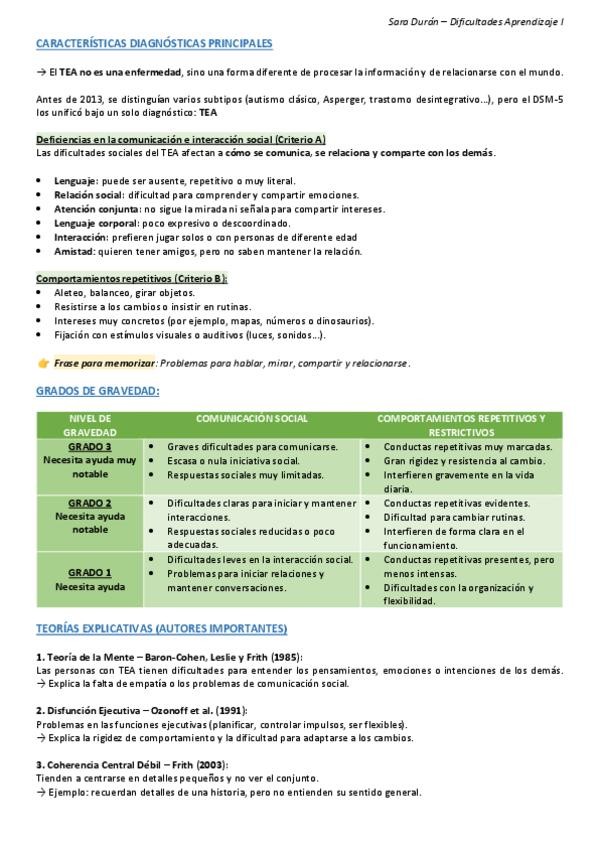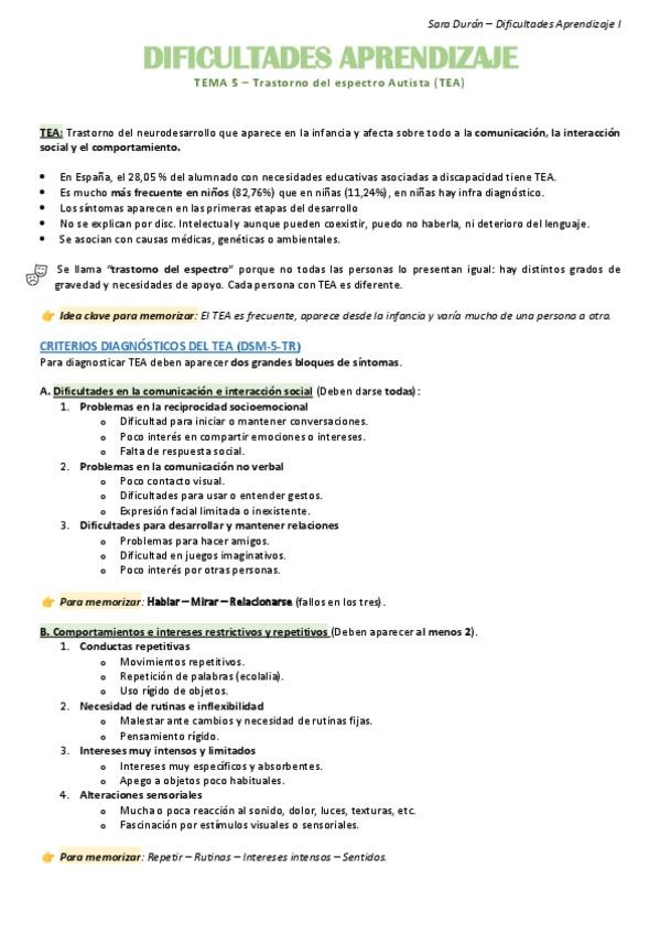 Tema 5, Resumen TEA, Trastorno del espectro autista, Dificultades del aprendizaje.