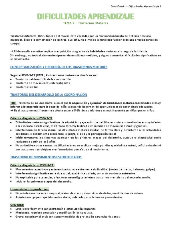 TEMA 9, TRASTORNOS MOTORES, RESUMEN DIFICULTADES APRENDIZAJE 1