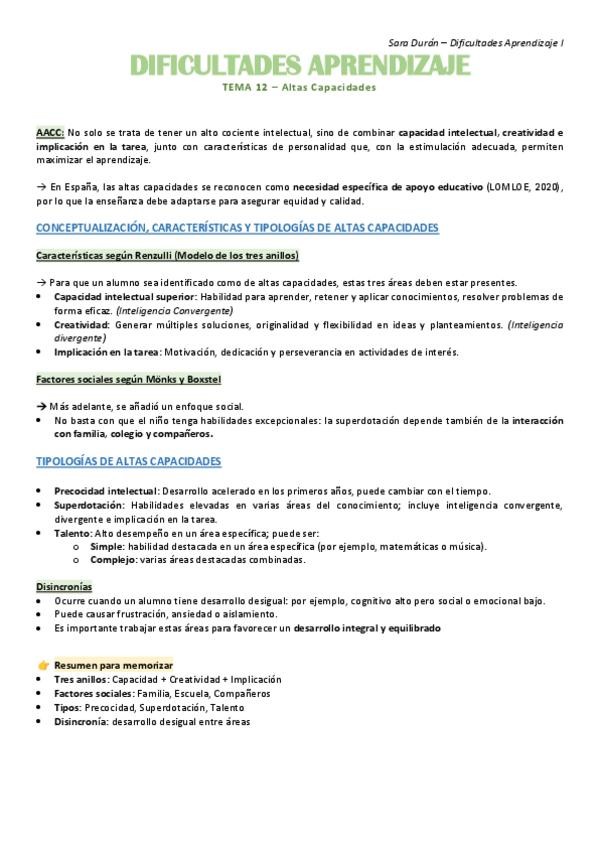 TEMA 12 - ALTAS CAPACIDADES, RESUMEN DIFICULTADES APRENDIZAJE I