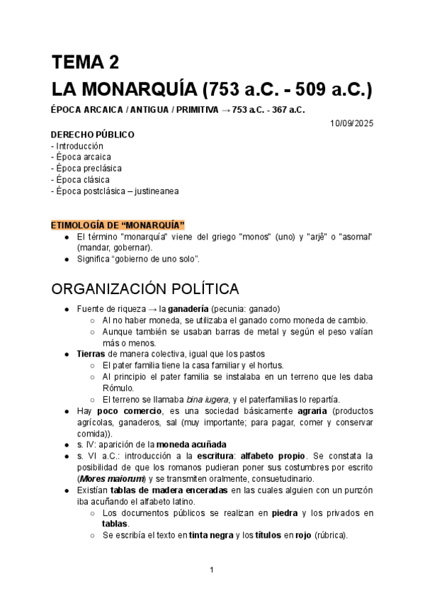 Apuntes de 1º de Derecho Romano: Tema 2 (Monarquía, República, Principado y Dominado). Esquemáticos, con ejemplos de la profesora y prácticas de clase y tablas; de la profesora Lourdes Martínez de Morentin Llamas.