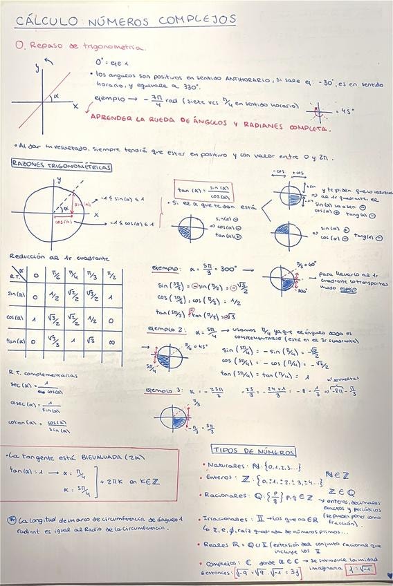 Repaso de trigonometría, razones trigonométricas, forma de un numero complejo, forma binómica, operaciones con complejos, plano complejo, forma polar, modulo, argumento, fórmula de Euler, forma exponencial, potenciación, raíces n-ésimas, propiedades, poli