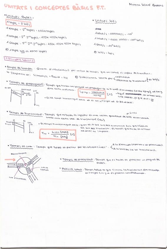 conceptes importants per saber fer problemes de FT. Unitats importants, temps de propagació, temps de propagació, ample de banda, temps en cua, fórmules.