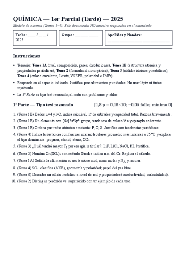 He publicado nuevos examenes de 1º Química: QUIMICA-1er-Parcial-Tarde-2025-Modelo-Temas-1-4.pdf