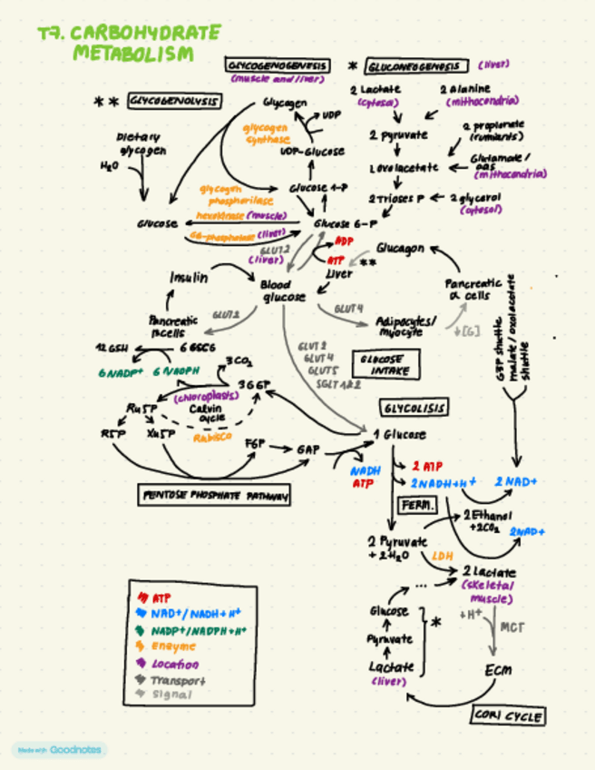 This mindmap does not contain all the information entirely, but gives a general idea of the pathway, substrates, enzymes and locations of the topic of carbohydrate metabolism