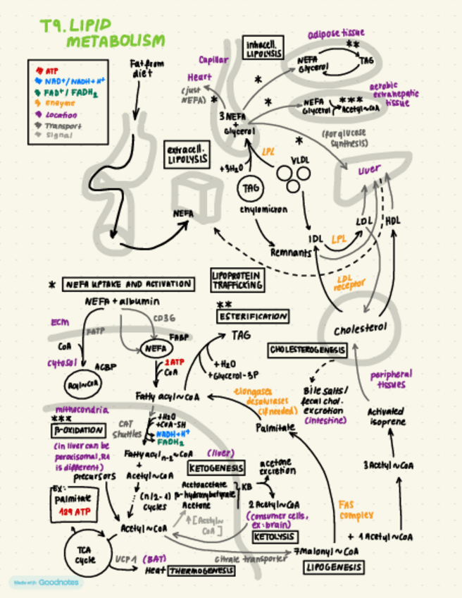 This mindmap does not contain all the information entirely, but gives a general idea of the pathway, substrates, enzymes and locations of the topic of lipid metabolism