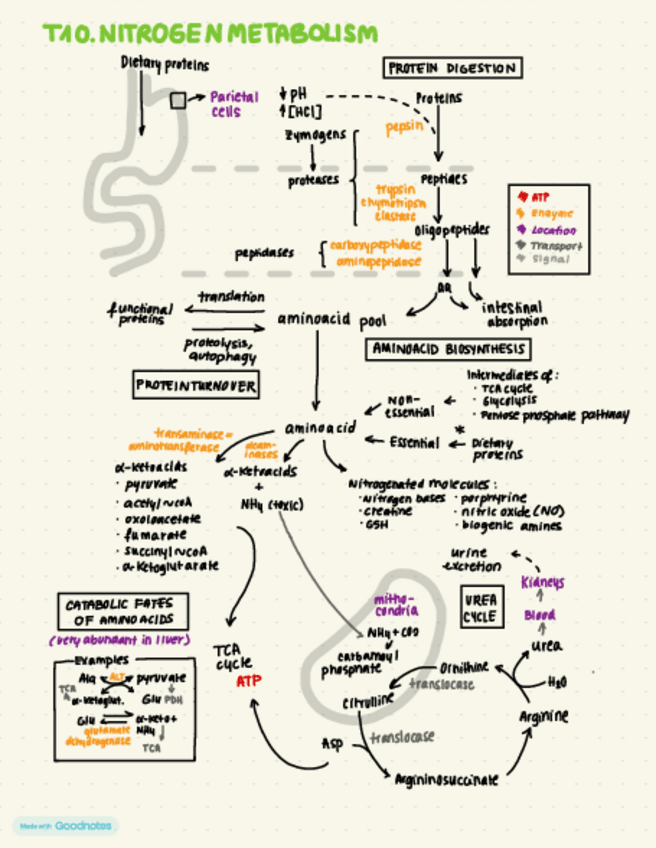 This mindmap does not contain all the information entirely, but gives a general idea of the pathway, substrates, enzymes and locations of the topic of nitrogen metabolism