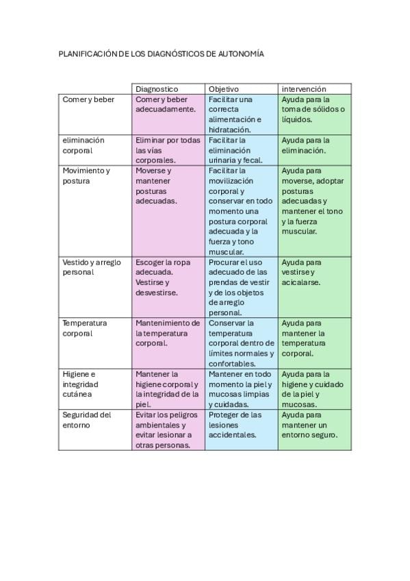 Esquema sobre la planificación de los diagnósticos de autonomía de CUIDADOS BÁSICOS