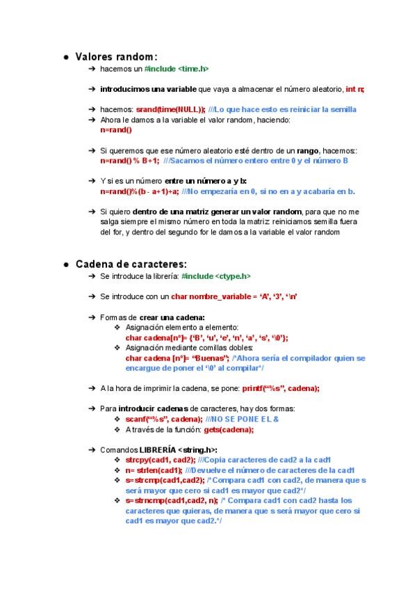 Resumen de la sintáxis de C. Cómo proceder a la hora de crear matrices, cadenas de caracteres, valores aleatorios y todo lo que hay que saber para crear funciones.
