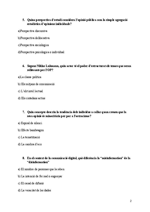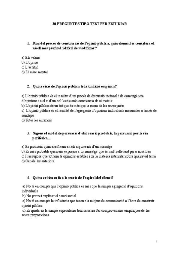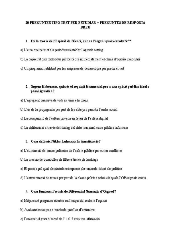 Amb aquest test i les respostes breus + l'altre document de test que tinc publicat, abarco tot el temari d'Opinió Pública. Molta sort!