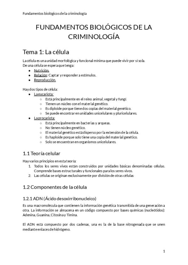 Apuntes con todos los temas de la asignatura de primer trimestre Fonaments Biologics a la criminología.