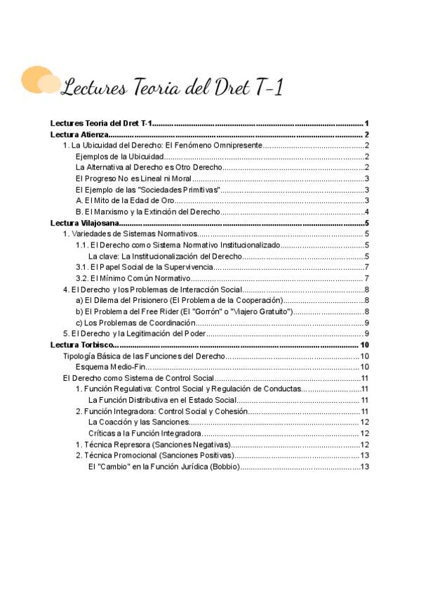 Os dejo un resumen de todas las lecturas que corresponden al tema 1 de la asignatura Teoria del Dret (Atienza, Vilajosana y Torbisco). En este documento encontrareis esquemas, resúmenes y una explicación comprensible. Profesor Josep Lluís Martí Año 2026 P