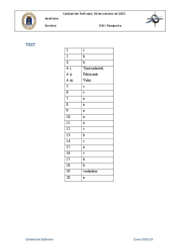 He publicado nuevos examenes de 4º Calidad del Software: Examen-A-Solucion-1PARCIAL.pdf