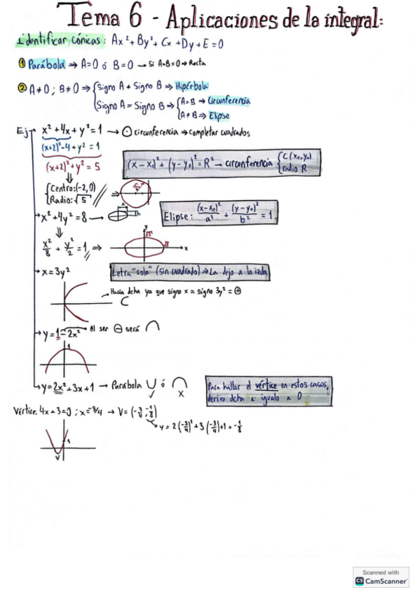 Resumen de los apuntes del Tema 6 - Aplicaciones de la Integral, de Cálculo I, con las fórmulas importantes destacadas y ejemplos resueltos