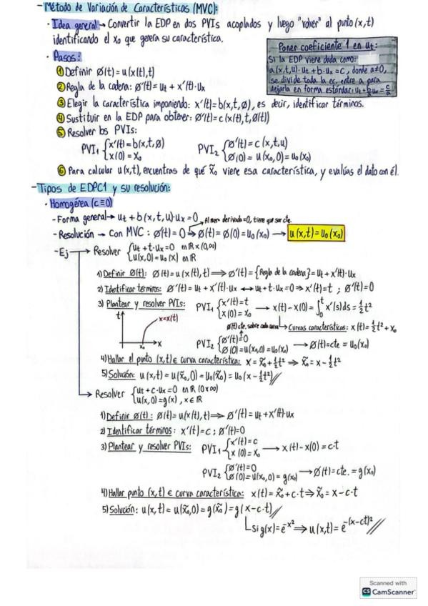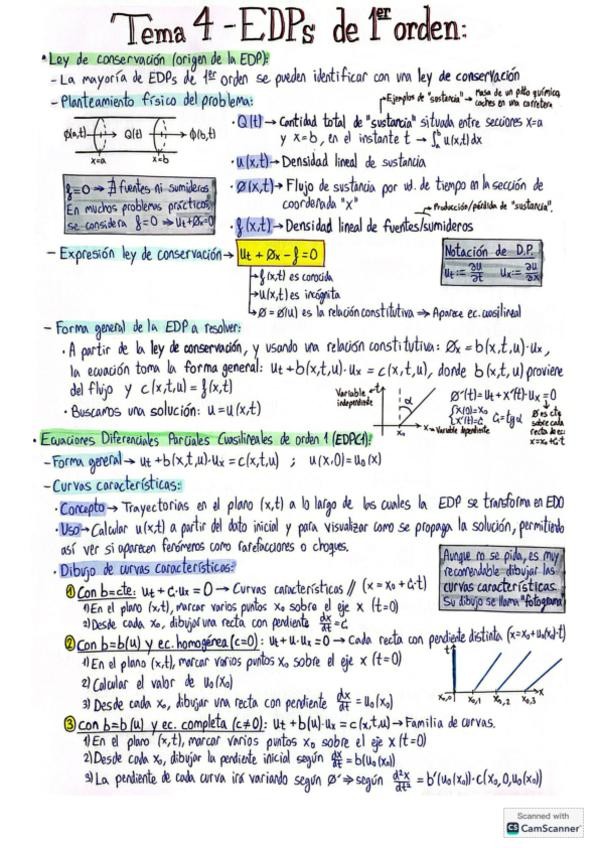 Resumen de los apuntes del Tema 4 - EDPs de 1º orden, de Ecuaciones Diferenciales, con explicaciones paso a paso y ejemplos de cada tipo de EDPC1