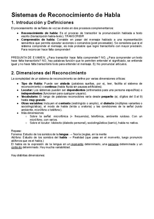 Unidad sistema auditivo, parte 5: Sistema de reconocimiento del habla Resumen y posibles preguntas de examen que dijo el profe en clase.