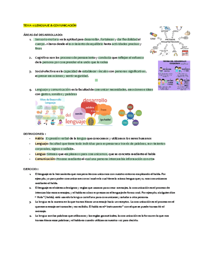 Tema 1. Lenguaje y comunicación - Áreas del desarrollo - Definiciones de habla, lenguaje, lengua y comunicación - Elementos de la comunicación - Hitos de desarrollo comunicativo - Componentes del lenguaje - Lomloe (competencias, normativa...)
