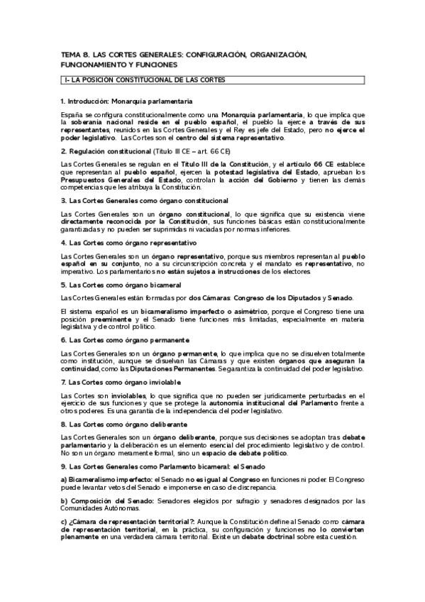 LAS CORTES GENERALES (CONFIGURACIÓN, ORGANIZACIÓN, FUNCIONAMIENTO Y FUNCIONES)