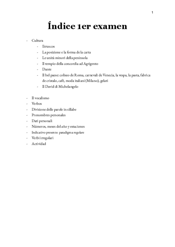 Apuntes italiano temas 1-5. Contiene vocabulario básico, Cultura básica, Fonética, verbos regulares e irregulares, división de las sílabas, datos personales, pronombres personales, números, meses del año, estaciones, días de la semana