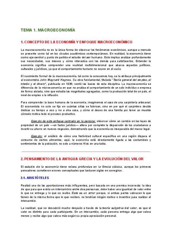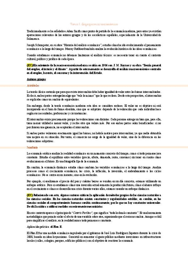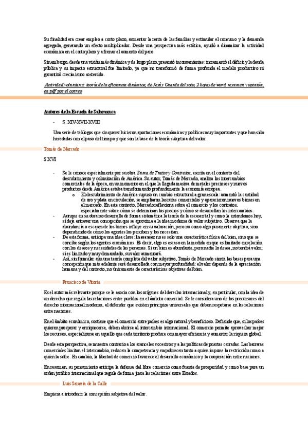 Este tema resume la evolución del pensamiento económico desde los autores griegos como Aristóteles hasta la macroeconomía moderna. Se analizan las aportaciones de la Escuela de Salamanca, con figuras como Juan de Mariana, que anticipan la teoría subjetiva