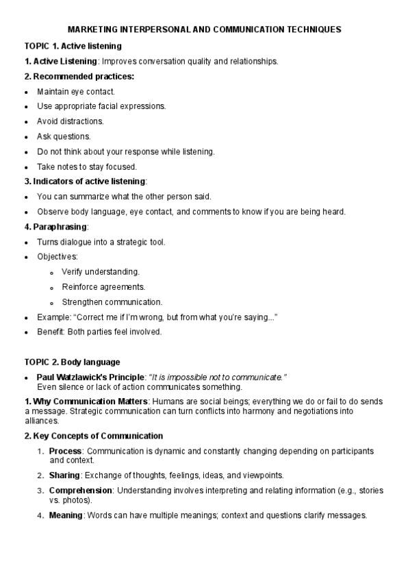 Resumen de el contenido del examen final de marketing y técnicas de comunicación interpersonal para el grado de marketing en inglés