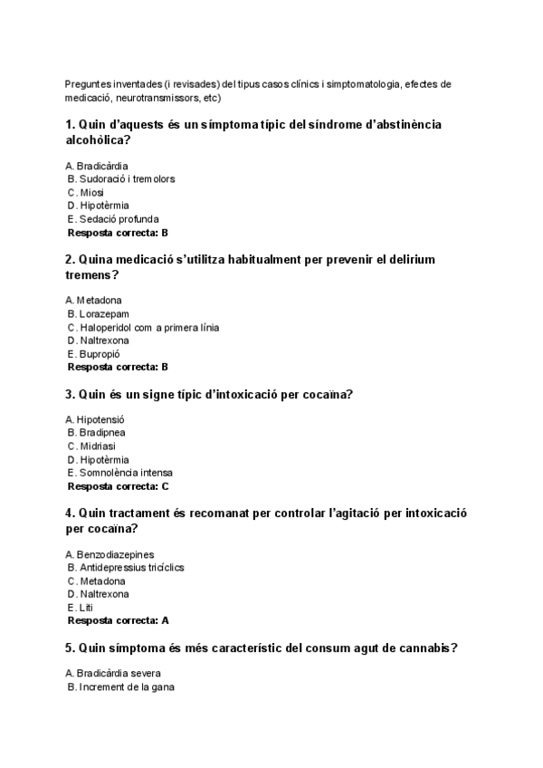 T3 errada: prova més comuna x detctar->ORINA i s'excreta poc a pH8 T8 errada: Metadona te vida mitja mes llarga T6 errada: hiper i no hipoglucèmia T9 errada: cànnabis son psicomimetics, no psicoestimulants Als pdfs està ja arreglat