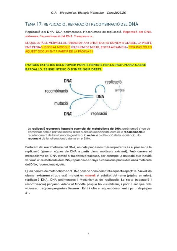 Tema 17 Replicació, reparació i recombinació del DNA (Bioquímica i Biologia Molecular del Curs 2025/26). Inclou el contingut dels dos vídeos penjats al Moodle, que no s'expliquen a classe (parts 2 i 3 del tema 17). 1r Grau en Medicina URV