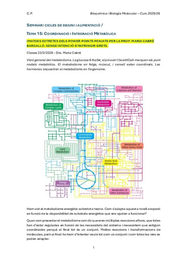 Apunts del seminari que és el Tema 15: COORDINACIÓ I INTEGRACIÓ METABÒLICA (Bioquímica i Biologia Molecular del Curs 2025/26, Dra. Maria Cabré Bargalló) 1r Medicina URV