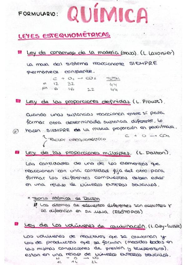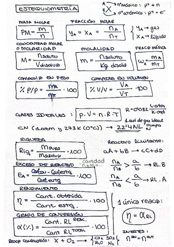 Apuntes y formularios de todo el cuatrimestre de química: Estequiometría, termoquímica, estados de la materia, gases, líquidos y soluciones, cinética química, equilibrio químico, energía libre y entropía.