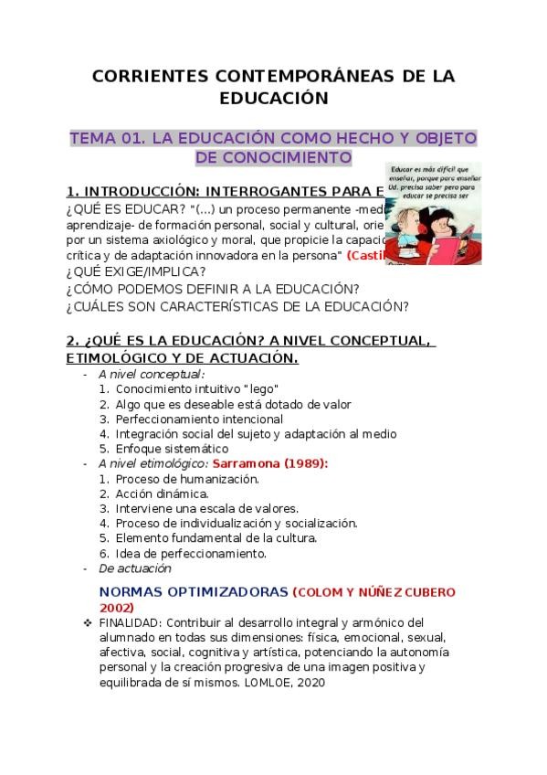 Apuntes del tema 1 de la asignatura Corrientes Contemporáneas de la Educación, impartida por Encarnación Sánchez Lissen.