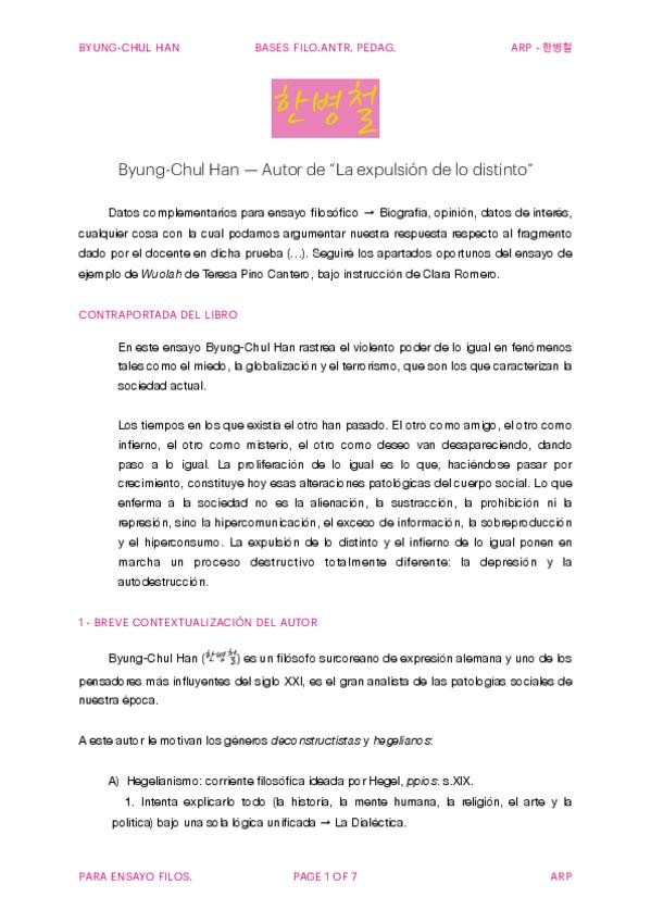 Este es el ensayo de la obra que elegí para el examen. "La expulsión de lo distinto" por Byung-Chul Han (2017)