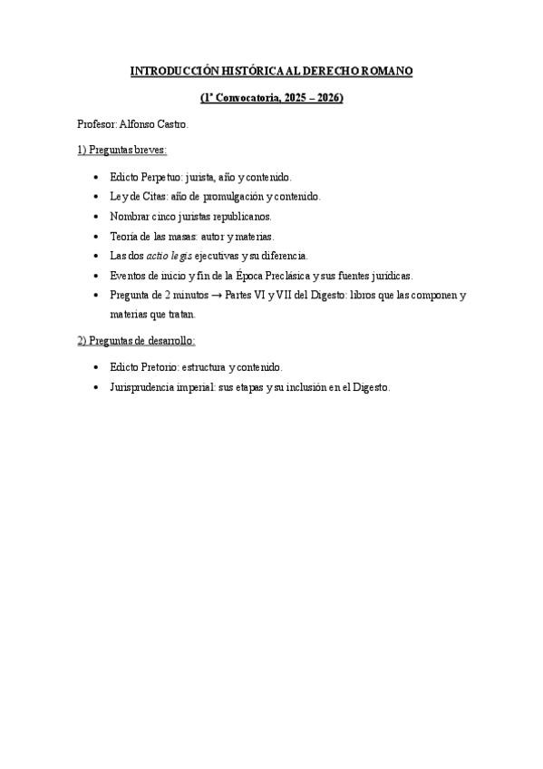 Examen de la 1ª Convocatoria de Introducción Histórica al Derecho Romano del curso 2025 - 2026, impartida por Alfonso Castro.