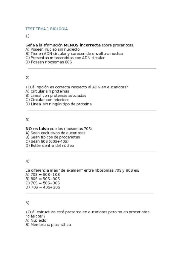 Test No oficiales Tema 2 Biologia Celular Primer Curso , USAL para practicar el contenido