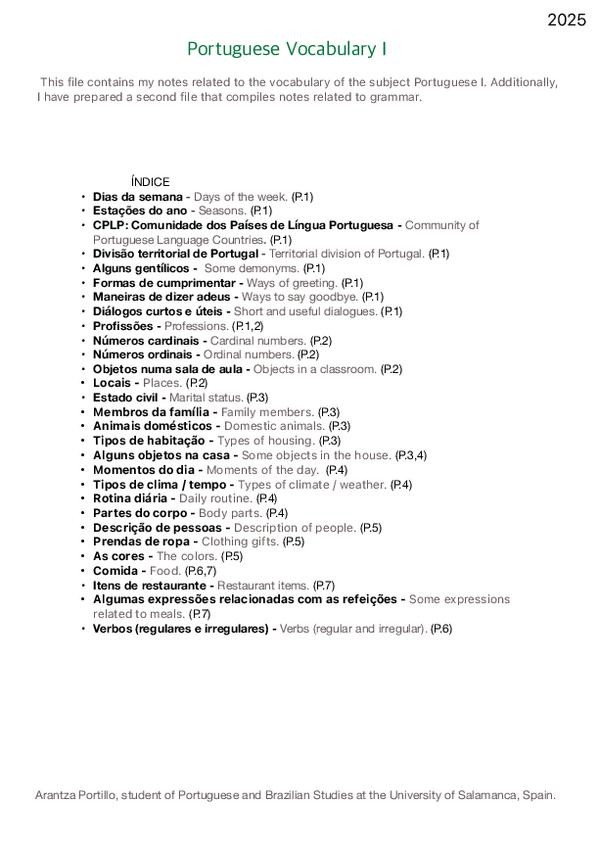 Portugués I: Vocabulario. Este archivo contiene mis apuntes sobre el vocabulario de la asignatura Portugués I. Además, he preparado un segundo archivo con apuntes sobre gramatica. Portuguese I: Vocabulary. This file contains my notes related to the vocab