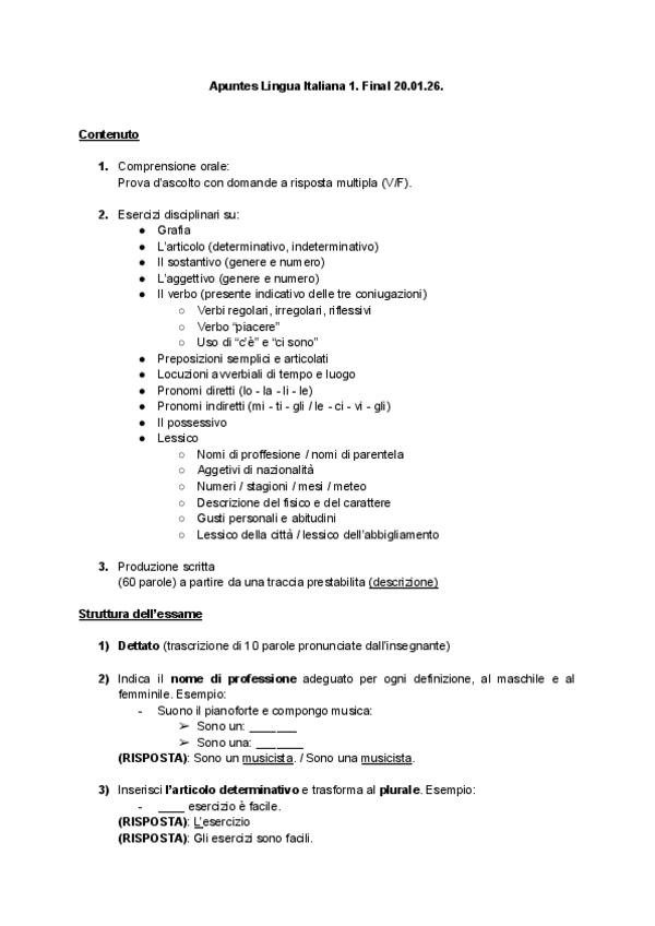 Apuntes completos para el examen final de Italiano 1. Recoge el contenido de las diapositivas expositivas de clase, ampliado con algo más de vocabulario y anotaciones propias. Incluye un modelo general de examen (proporcionado por el profesorado) que pued